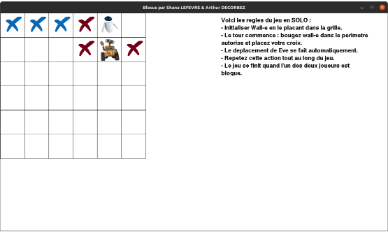Cette capture d'écran représente une partie en cours que ce soit pour le mode solo ou bien pour le mode multijoueur. Le pion "Wall-e" bloque le pion "Eve"