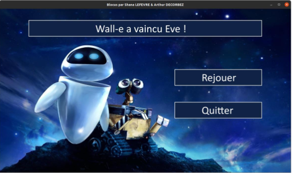 Dès que l'un des deux pions est bloqué par l'autre joueur, alors le jeu affiche cette fenête avec les réultats et elle propose au joueur de rejouer ou bien