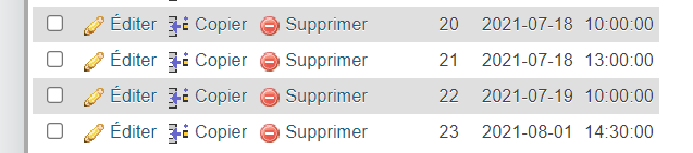 Puis, l'utilisateur créé des dates et des heures. Pour cet exemple nous utiliserons les dates suivantes : 18/07/2021 à 10h, 18/07/2021 à 13h, 19/07/2021 à 10h, 01/08/2021 à 14h30. Il faut valider l'horaire à chaque fois !