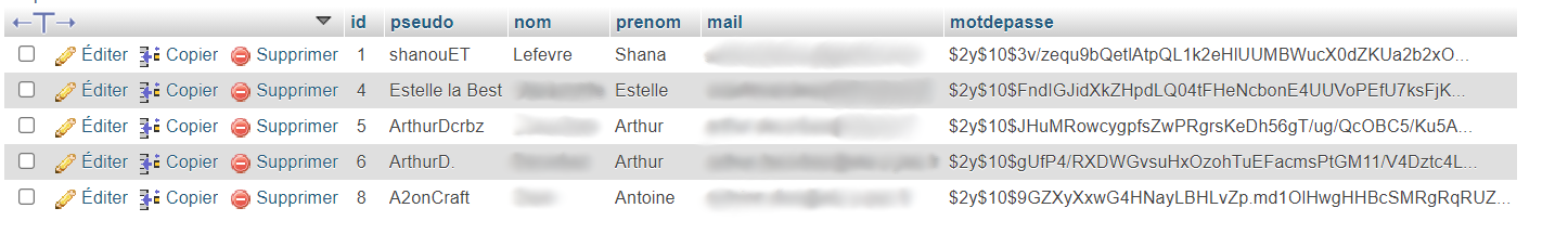 Pour une question de sécurité auprès de nos membres, nous avons achuré les mots de passe. Nous vérifions que tout se passe bien dans la base de données au niveau de la table membre :