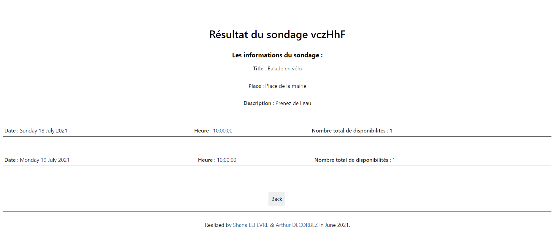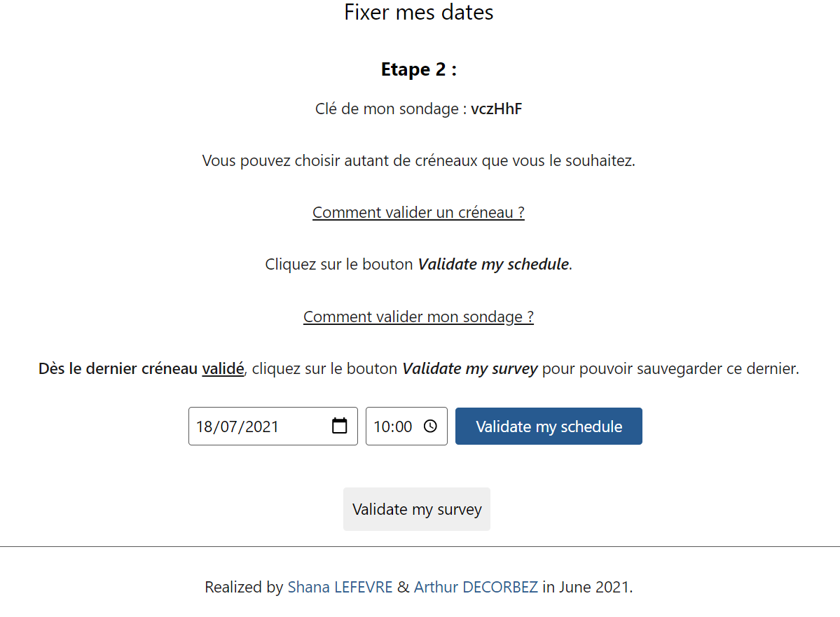 Après la validation du dernier horaire, l'internaute valide le sondage. Par défaut, le sondage est ouvert. L'utilisateur récupère la clé pour la donner aux personnes qui répondront au sondage. Les données sont automatiquement envoyées à la base de données quand l'utilisateur valide les différentes informations et données.