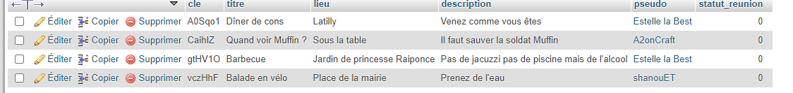 Après avoir cliqué sur Create survey, les données sont envoyées dans la table reunion. Par défaut, la réunion est ouvert (0). L'utilisateur a la possibilité de gérer le statut de la réunion et donc de le fermer (1).