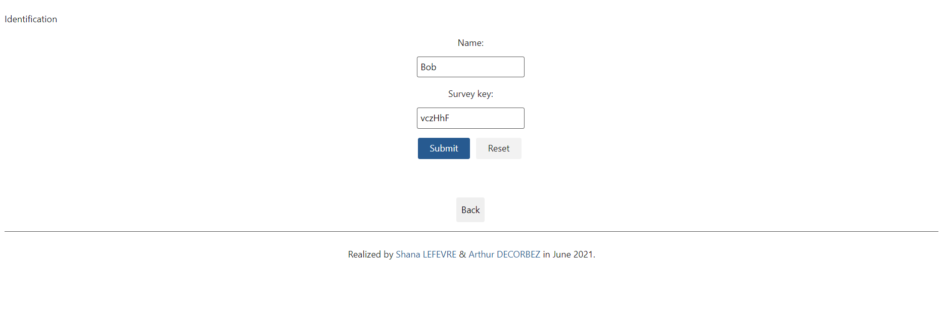 L'utilisateur doit entrer son nom et la clé pour accéder à un sondage spécifique. Une fois cette étape faite, il peut répondre au sondage et valider sa/ses réponse(s). Les données seront automatiquement envoyées dans la base de données.