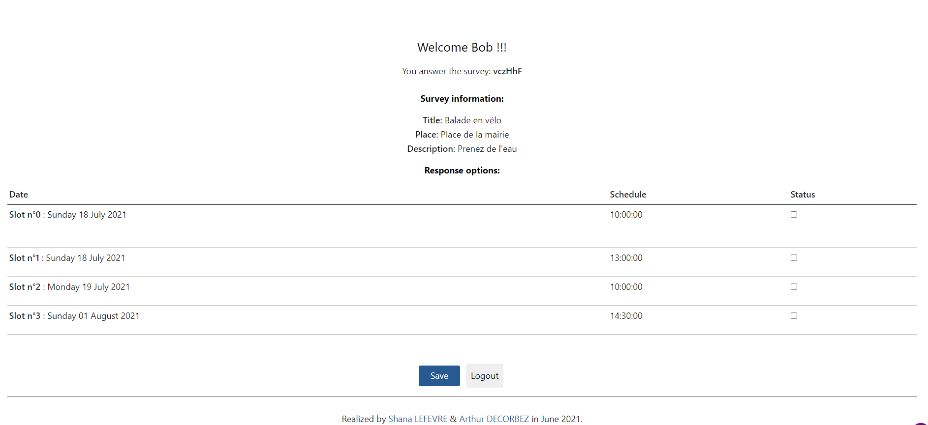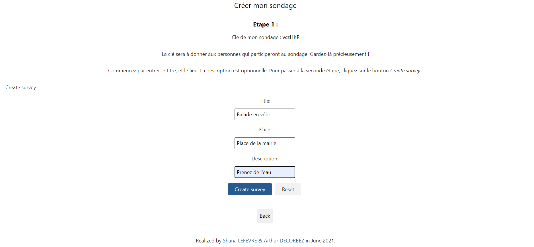 L'utilisateur peut créer un compte et ensuite créer un rendez-vous. Une clé lui sera fournit pour qu'il la transmette aux personnes qui répondront au sondage. Ce dernier pourra soit être ouvert, soit être fermé. Dès le sondage fermé, l'utilisateur aura accès aux données.