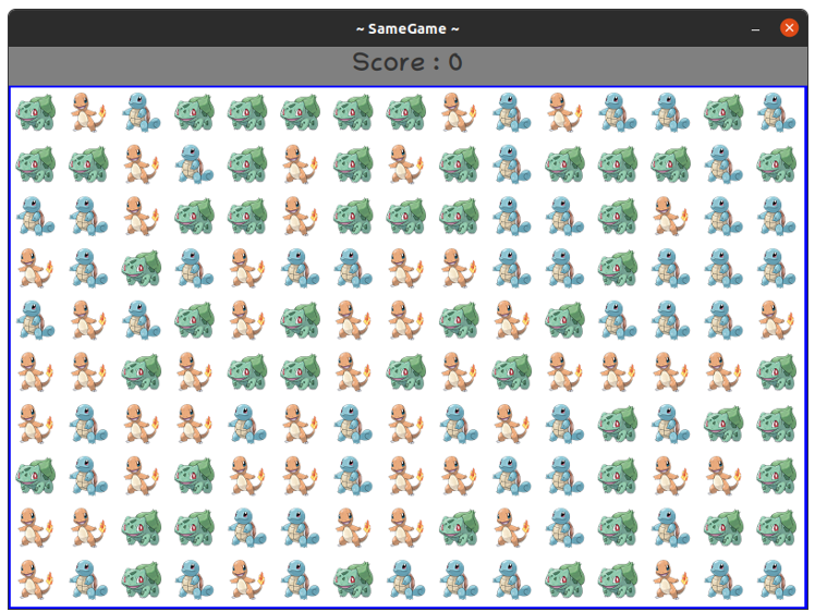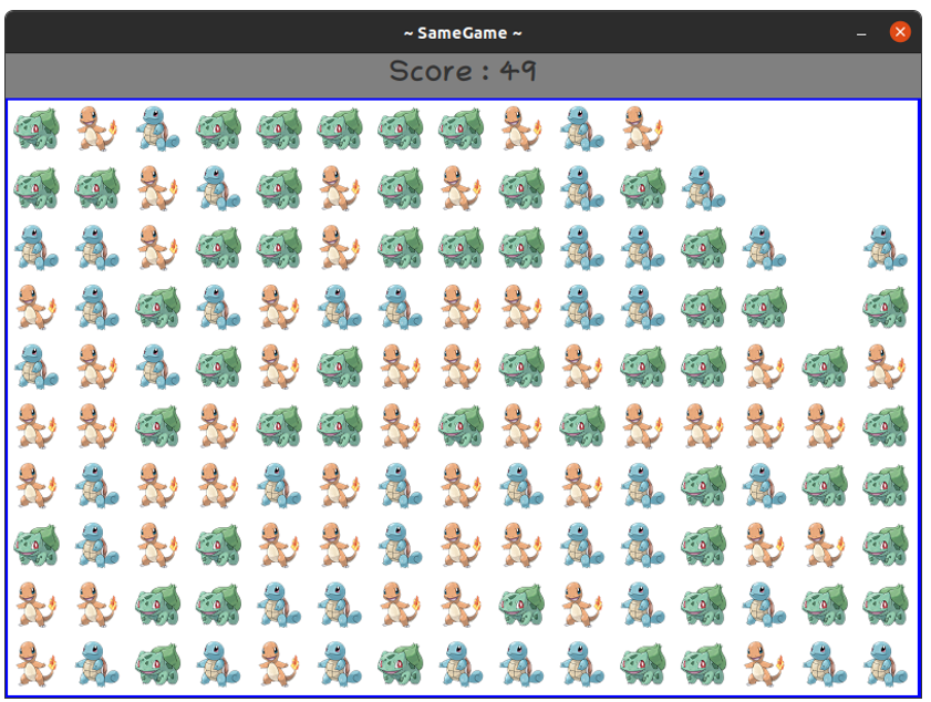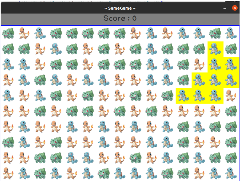 Ce projet en java a été réalisé en binôme en avril 2021. Le but est de supprimer tous les blocs en créant des groupes de même bloc. La partie se finit quand il n'y a plus de possibilité de faire des groupes. L'objectif est de réaliser le plus grand score. Le score se calcule avec la formule suivante : (n-2)² avec n qui représente la taille d'un groupe (nombre de bloc pour un groupe). La grille contient 15 colonnes et 10 lignes.