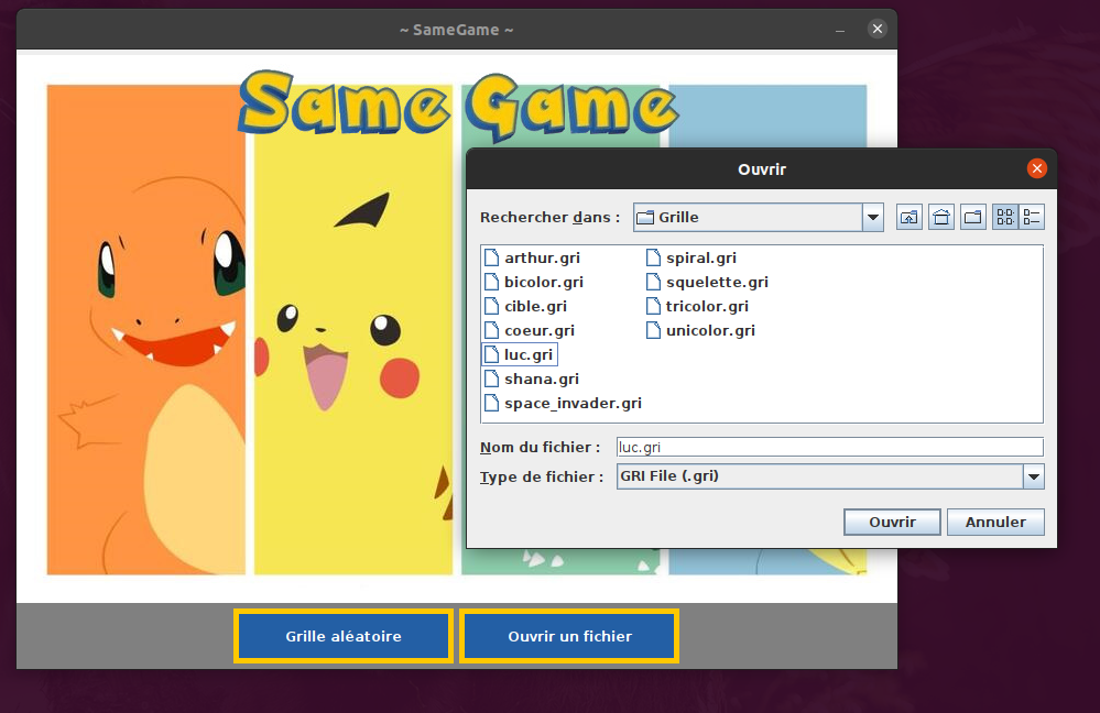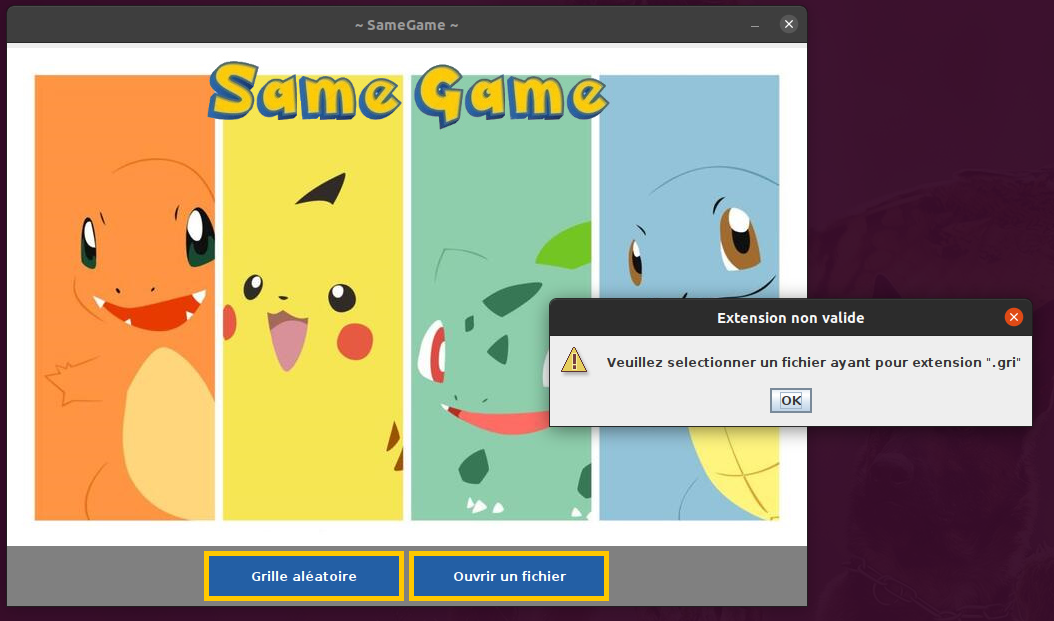 Si le joueur sélectionne un fichier n'ayant pas d'extension ".gri", alors un message d'erreur apparaît et retourne l'utilisateur sur le menu d'accueil.