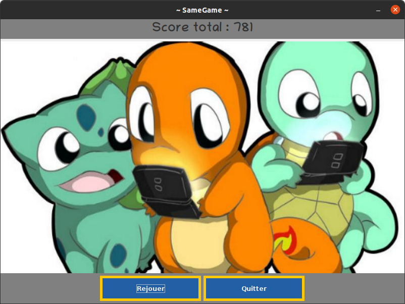 Quand il n'y a plus de possibilité de faire un groupe, alors la partie est finie. Le jeu nous renvoie sur notre menu de fin avec le score total et il propose au joueur de rejouer ou bien de quitter le jeu.
